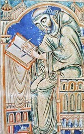 Seo agaibh sé radharc ar an scríobhaí meánaoiseach ag obair, ó fhoinsí na linne sin a bheag nó a mhór. Thug Liz faoi deara gur féidir nach raibh an staidiúir a bhíodh acu os comhair deasc claonta ró-eirgeanamaíoch (ergonomic). “Bheadh strus uafásach ar do rostaí,” a dúirt sí. Más fíor, cén fáth a ndearna siad é? Caithfidh go raibh buntáistí ag baint leis an gclár claonta. Nó an tuairim ró-loighciúil é sin?